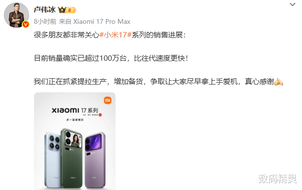 卢伟冰今日在社交媒体确认,小米17系列销量已经超过百万部,看清楚,卢伟冰说的是销量,而不是出货量,也就是说有超过100万部小米17已经卖到用户手中,按这个数据来看,小米17到目前为止确实有和iPhone 17拼一下的实力。